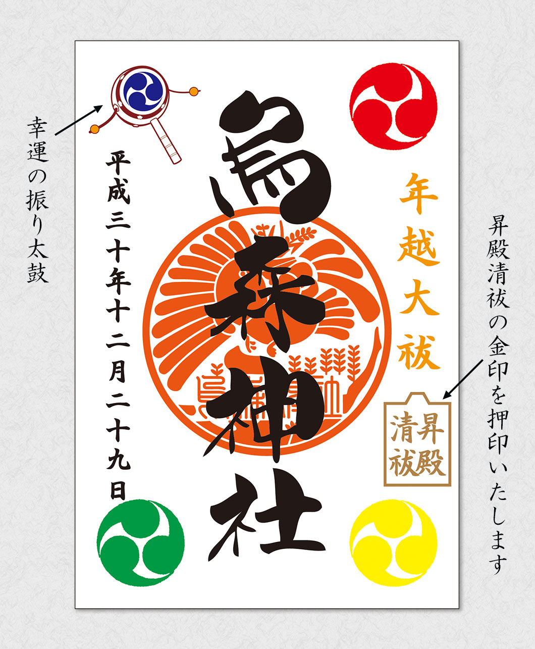 模様は当社の三つ巴社紋と烏の社紋と、来年の干支の亥の絵柄です。