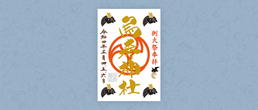 中央の社名は金の箔押し、朱印は陰三つ巴、四隅の黒い烏は金の箔押しの稲穂をくわえています。