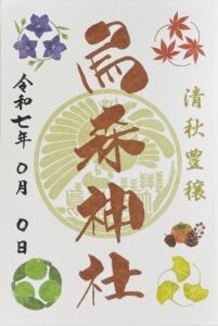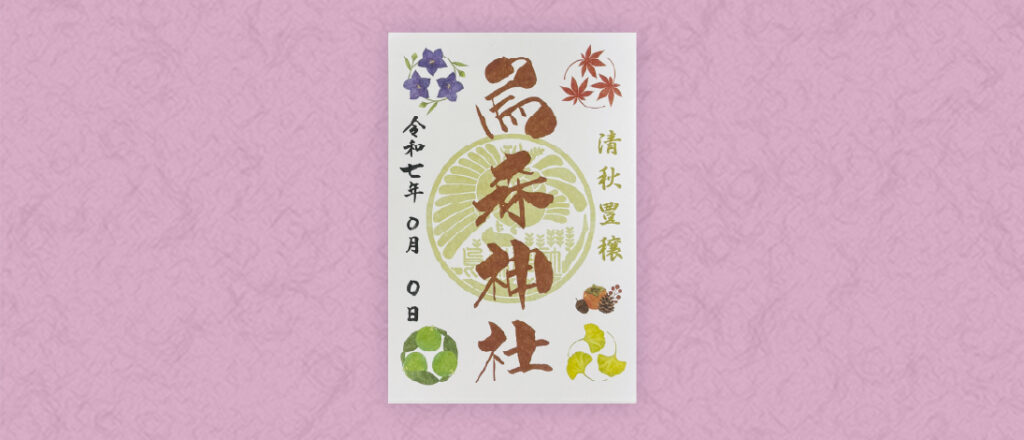 HOME新着情報秋の御朱印 秋の御朱印 2025.11.21 新着情報 / 直近の行事 授与期間 8月30日(日)~ 授与時間 午前9時〜午後4時半 初穂料 五百円 秋の御朱印を境内授与所にてお授けいたします。 秋の御朱印 ご希望の方全員にお授け出来るよう御朱印は多めにご用意いたしますが、どれほどの方が御朱印を受けられるかについては、予測しかねるところもございますので、やむなく授与期間、時間、内容などを変更する場合は、Twitterにてお知らせいたします。 ※御朱印は印字の一枚和紙でお授けいたします。お手持ちの御朱印帳にお書きすることは出来ません。